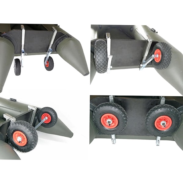 Дуже зручні та продумані колеса. Надійні струбцини, міцні матеріали, встановлення за декілька хвилин. Перевірив у справі — човен пересувається без проблем, навіть коли завантажений.